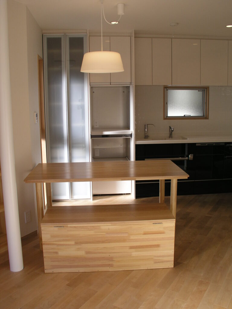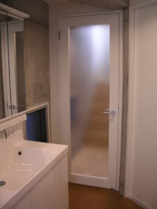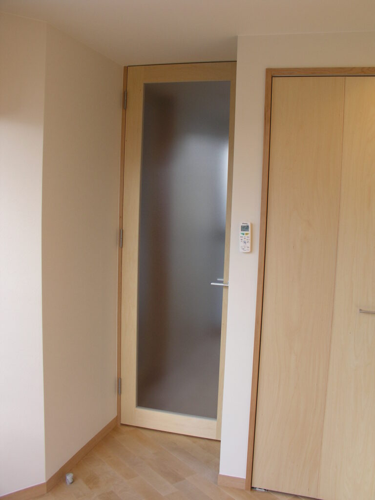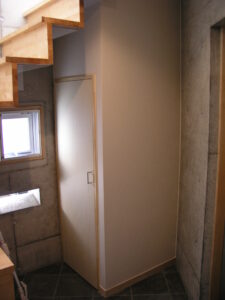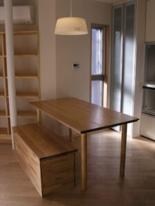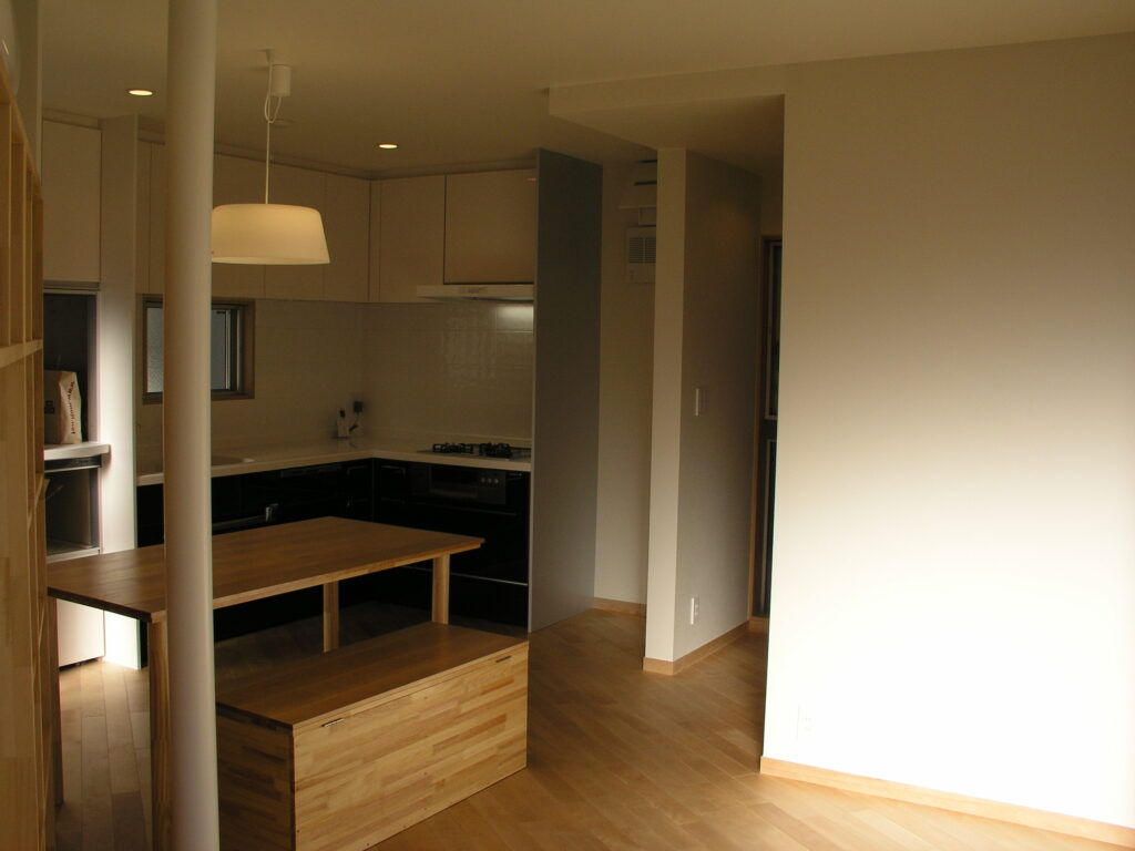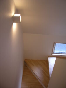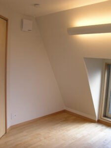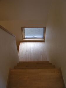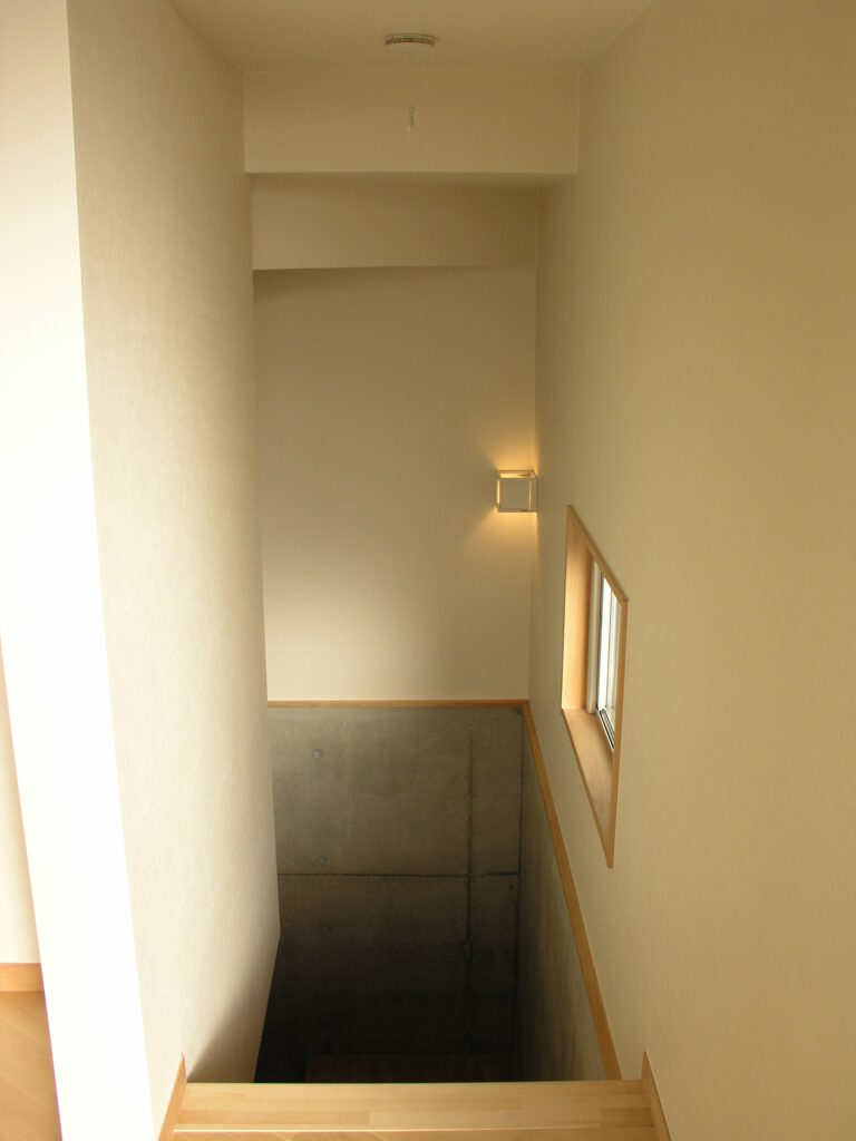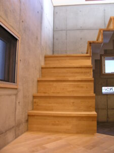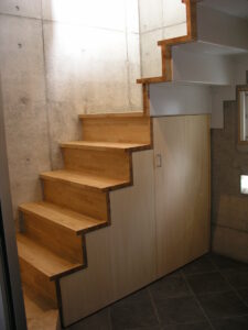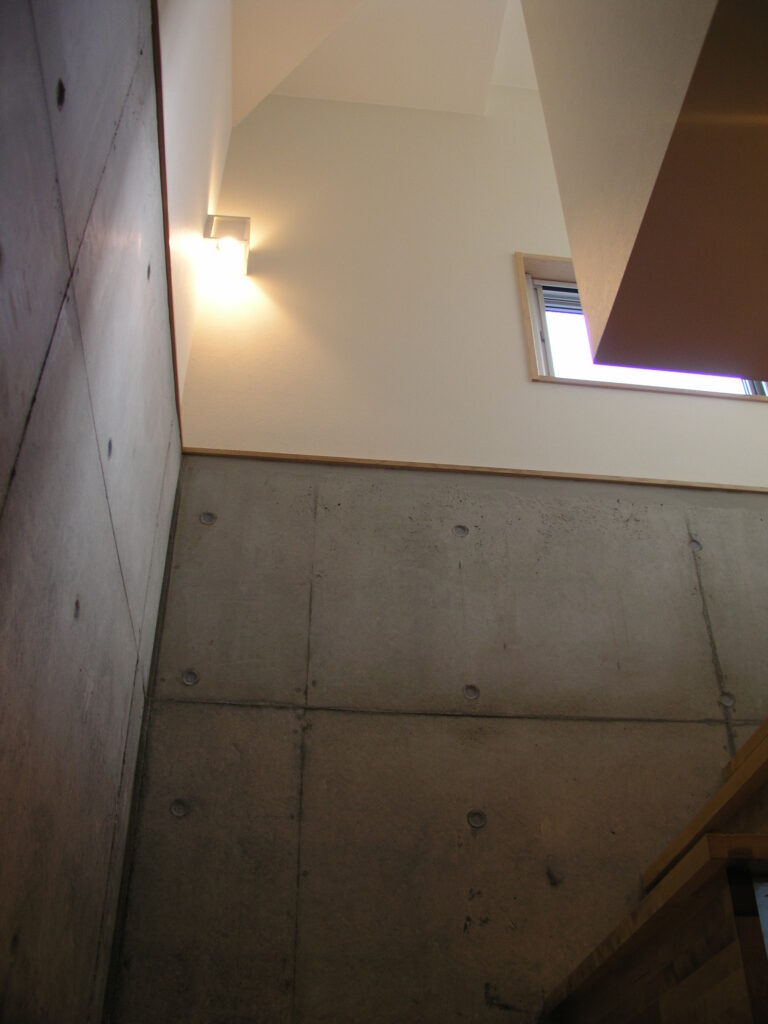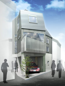大阪福島に建つ専用住宅、1階がRC造、2階3階が木造の混構造、敷地が変形で道路後退もあり駐車場もあり大変な設計と工事でした。
