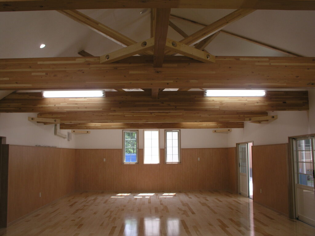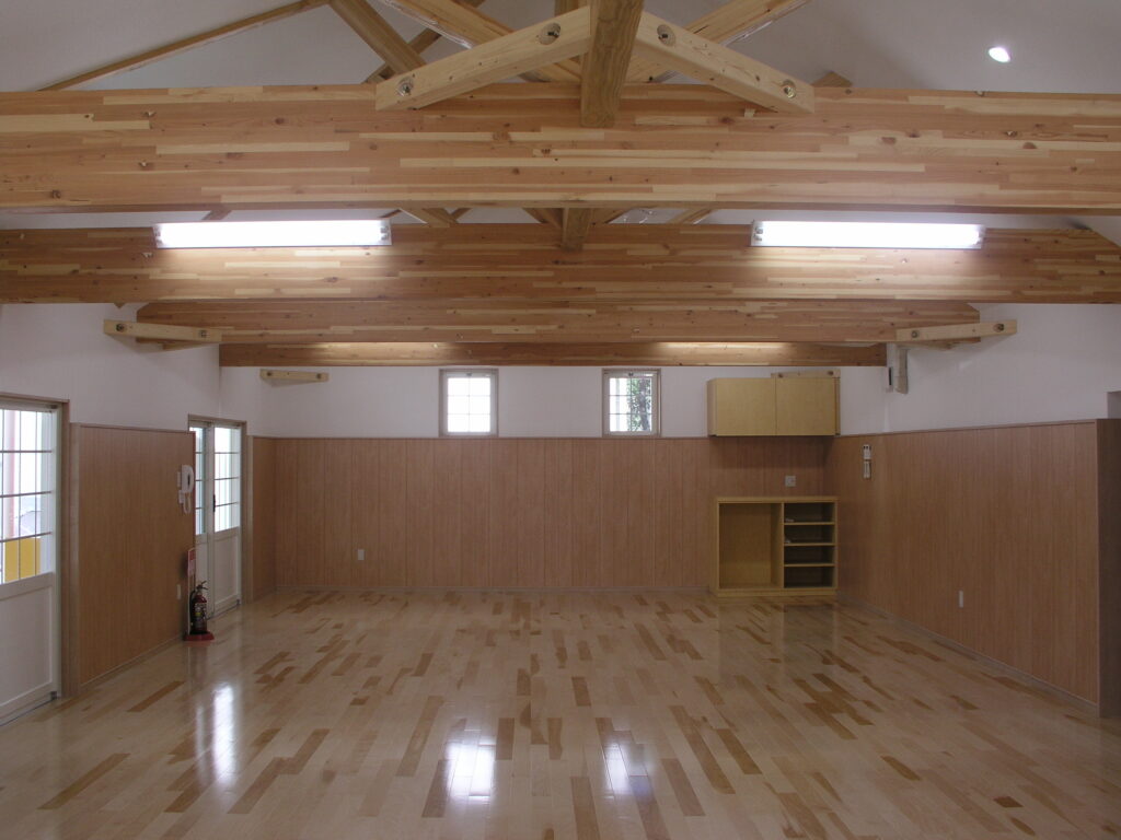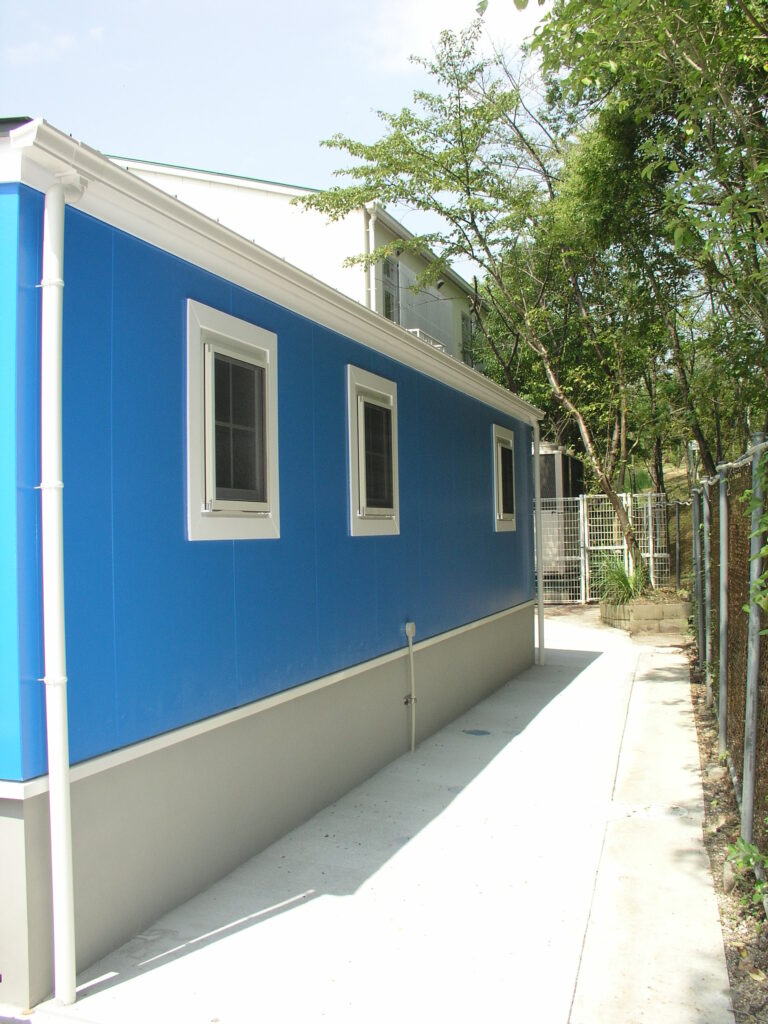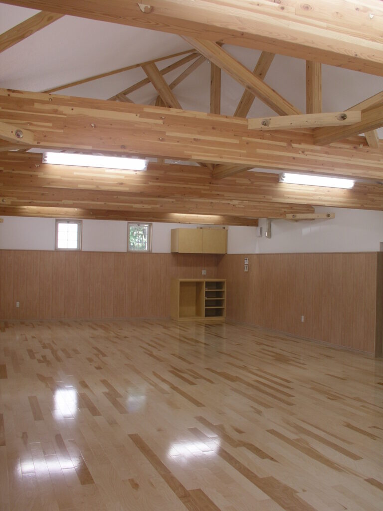 最後に残った既存教室を撤去、木造平屋の多目的室と軽量鉄骨の倉庫を建てました。