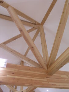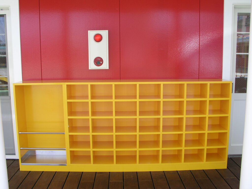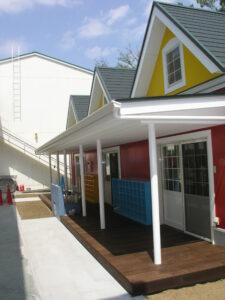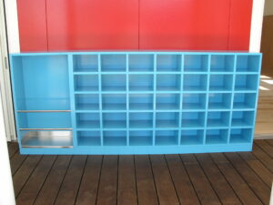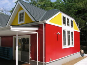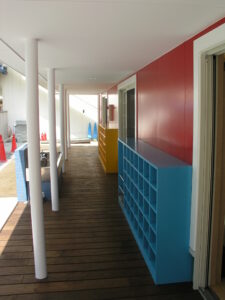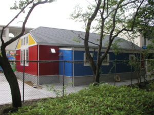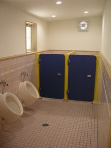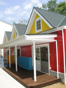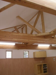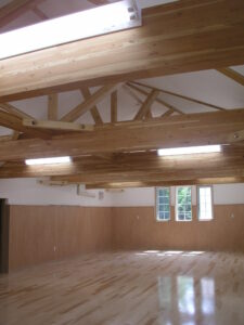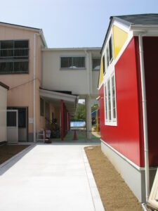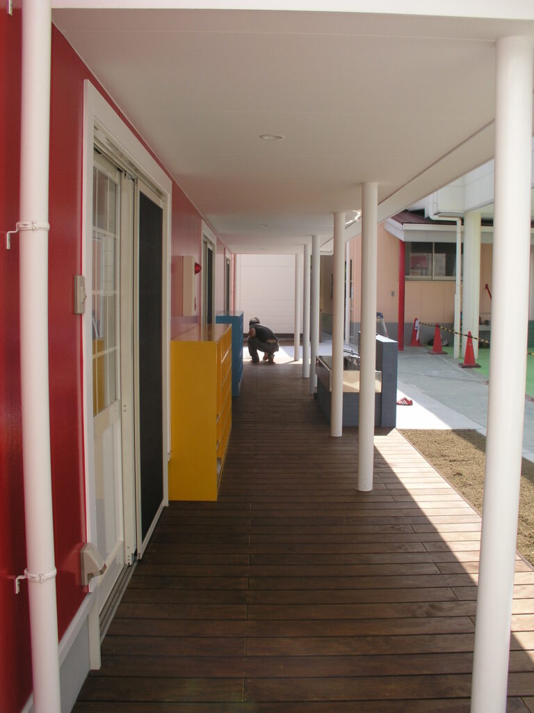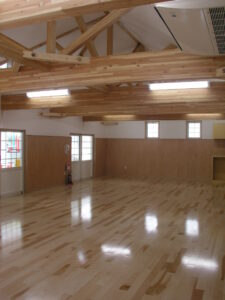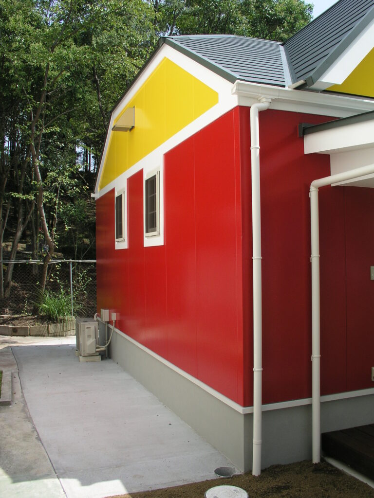 最後に残った既存教室を撤去、木造平屋の多目的室と軽量鉄骨の倉庫を建てました。